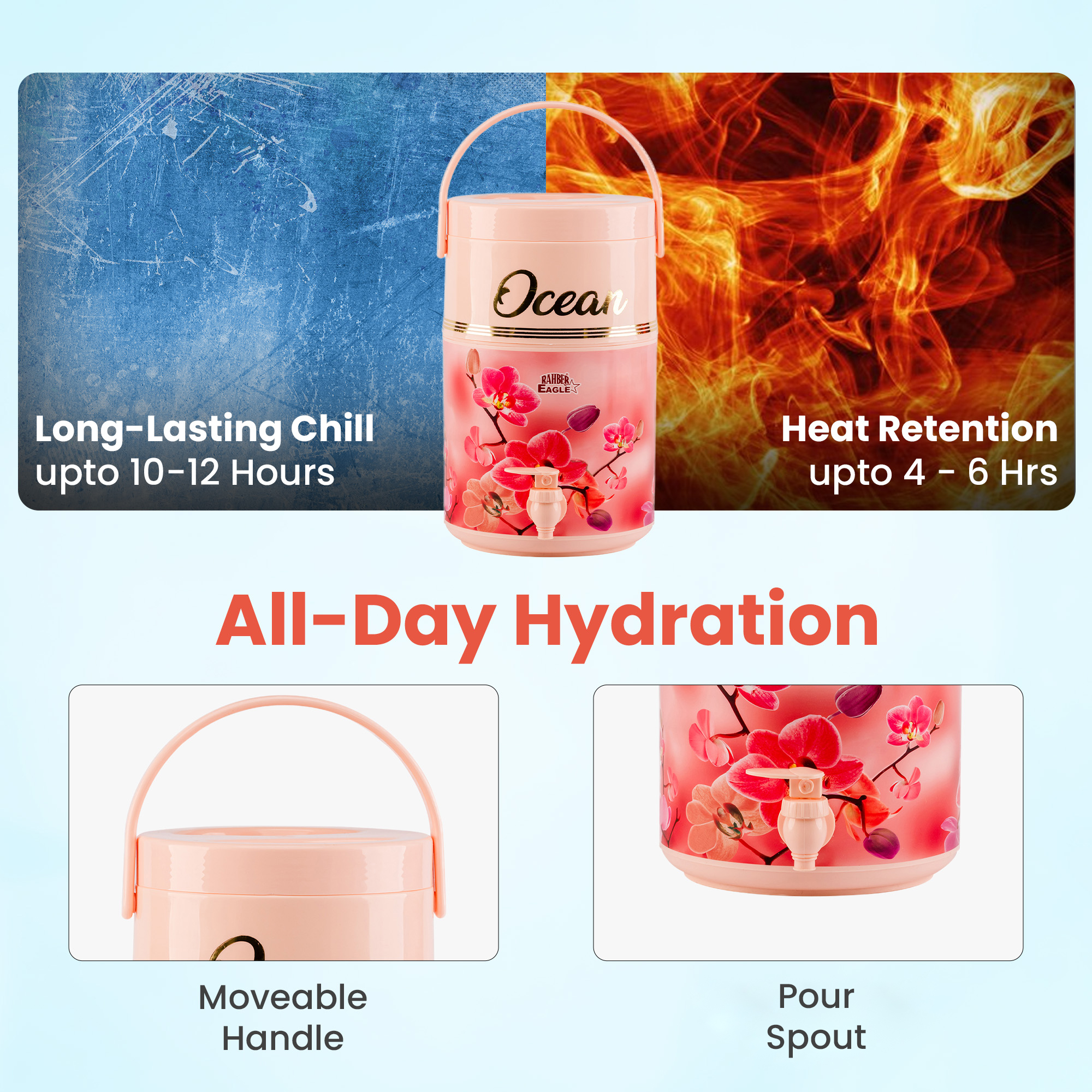 With a smooth & easy opening and an convenient pour spout, the Ocean small water cooler ensures fast, spill-free access to drinks during active moments. The lightweight build and ergonomic handle make carrying comfortable and simple