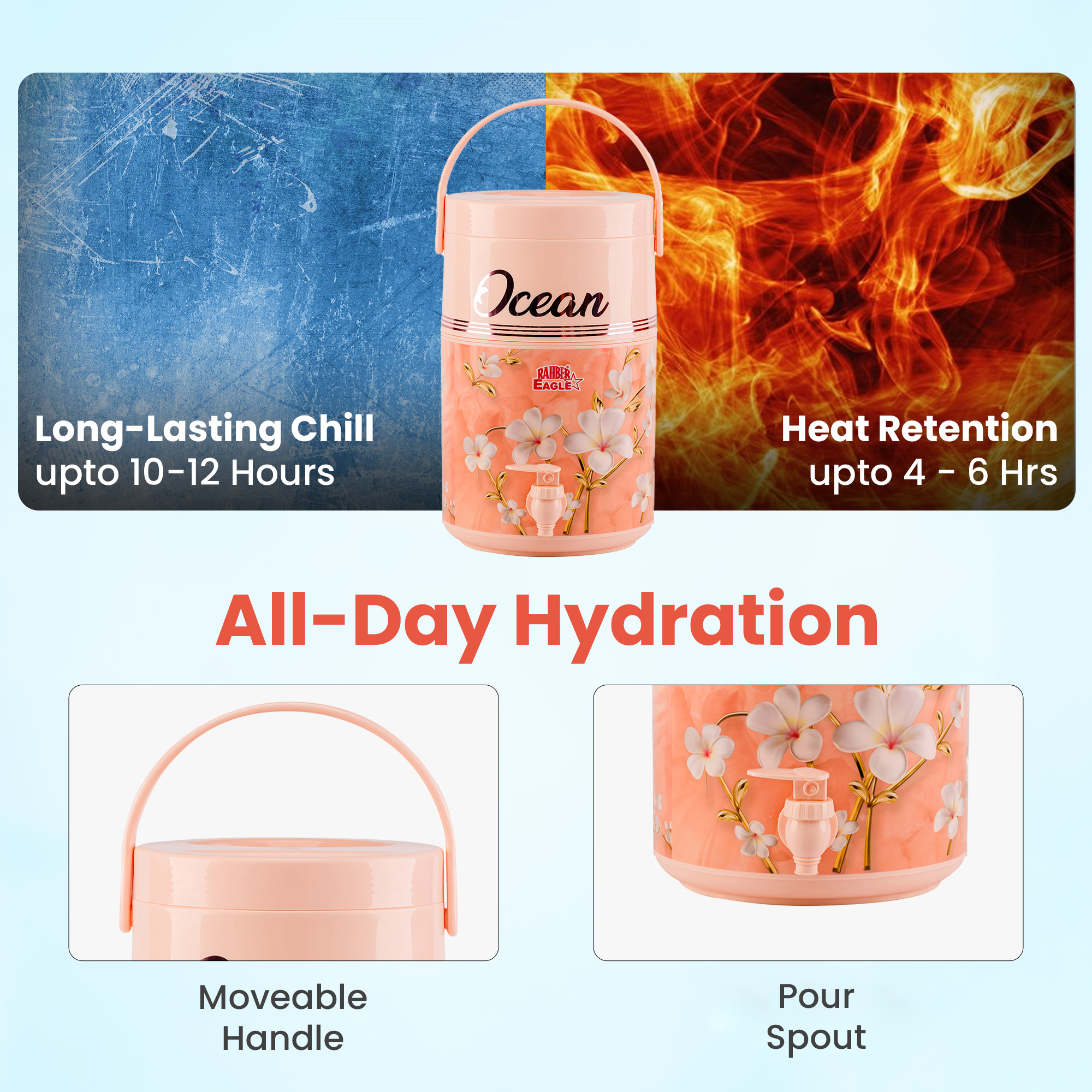 With a smooth & easy opening and an convenient pour spout, the Ocean small water cooler ensures fast, spill-free access to drinks during active moments. The lightweight build and ergonomic handle make carrying comfortable and simple