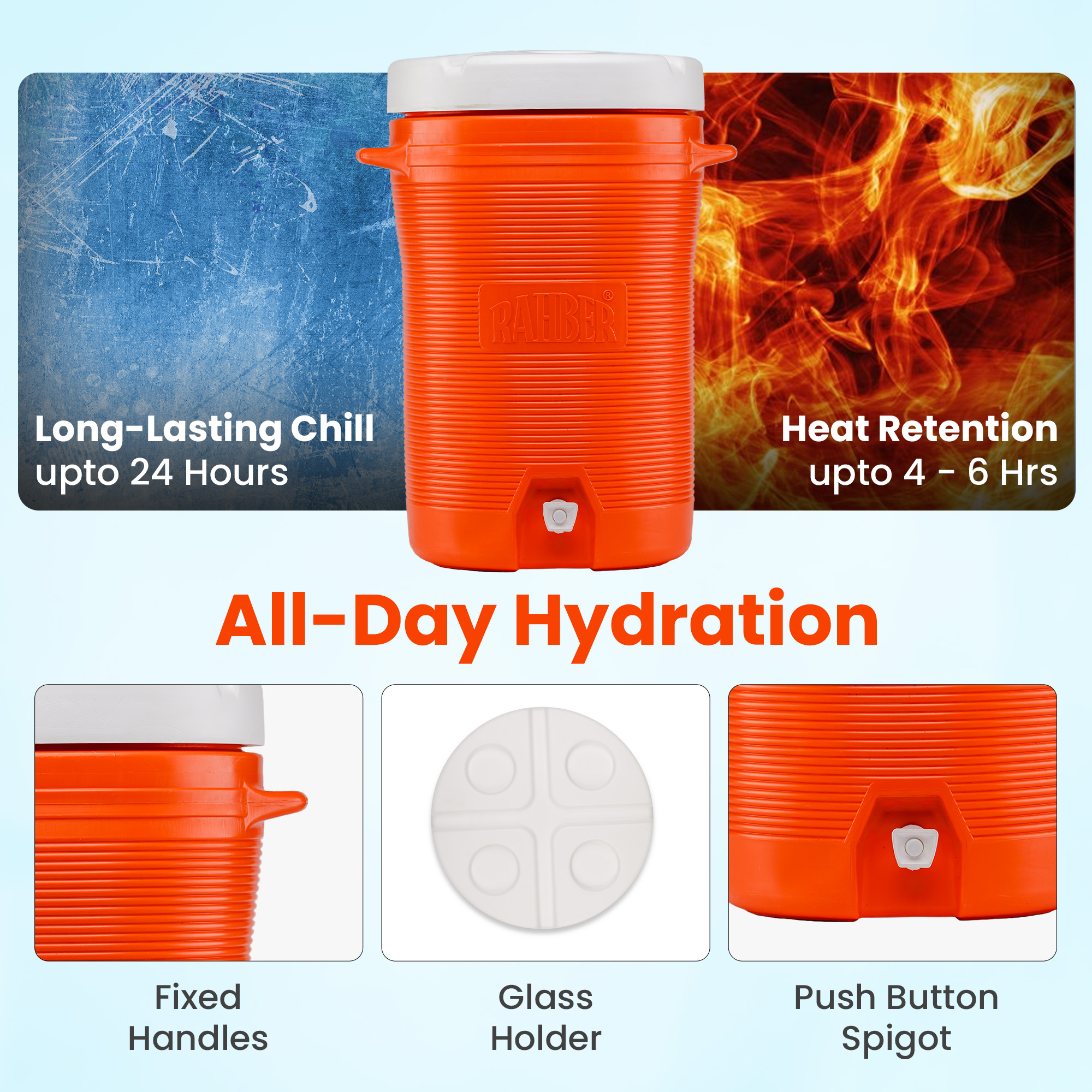 - Thick insulated walls maintain cold water for hours in outdoor heat